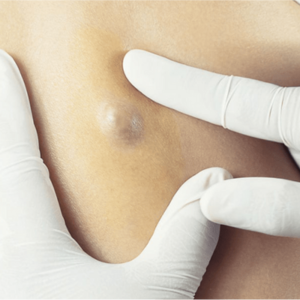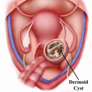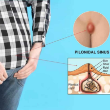 An abnormal skin growth located at the tailbone that contains hair and skin.The cyst is usually located near the tailbone and can become easily infected.