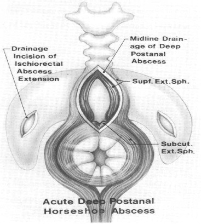 Horseshoe fistulas are deep posterior anal fistulas which extend into the ischiorectal space with either unilateral or bilateral extensions in the shape of a horseshoe.