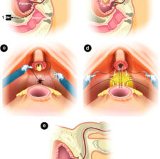 This procedure repairs a damaged or weakened anal sphincter that occurred during childbirth. Doctors identify an injured area of muscle and free its edges from the surrounding tissue. They then bring the muscle edges back together and sew them in an overl